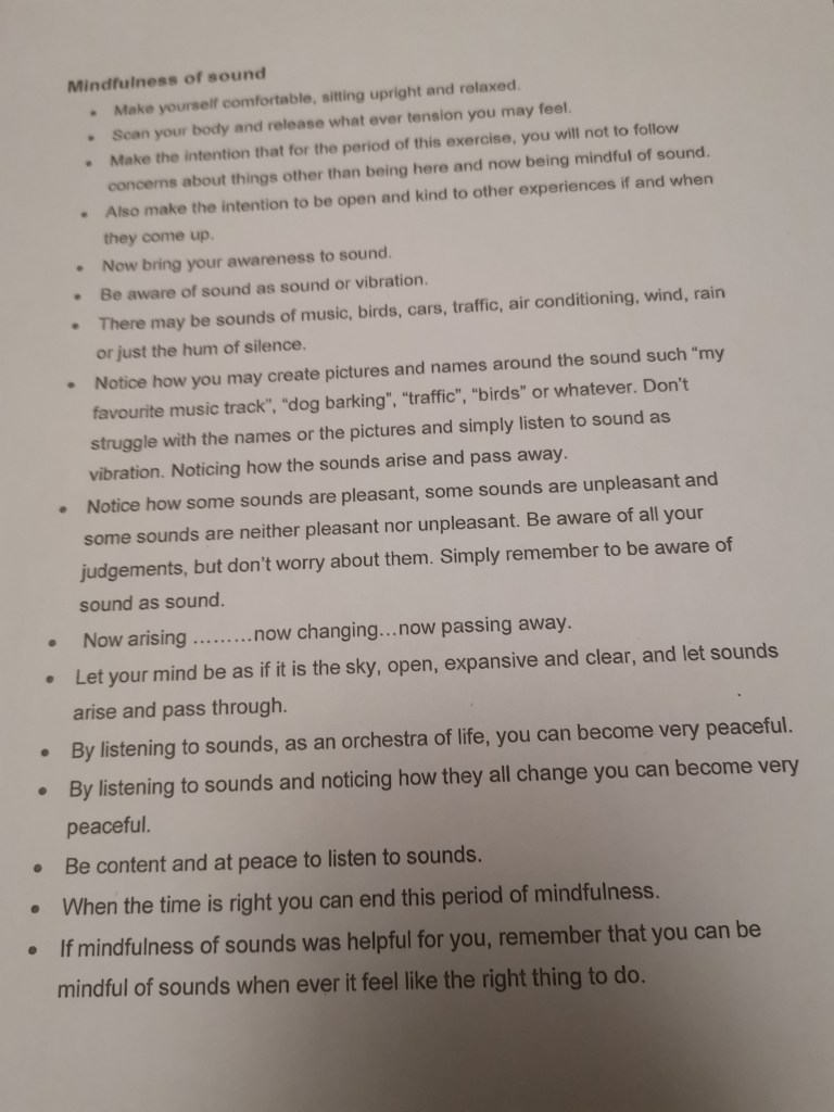 Sound-Music can have a profound effect on mood. When my mood was elevated recently I didn’t realise quite how much the music I was listening to was elevating it further. Relaxing music is good, at a low volume or even apps with relaxing sounds. Some people might like to lay down with ear plugs in to shut out stimulation completely.